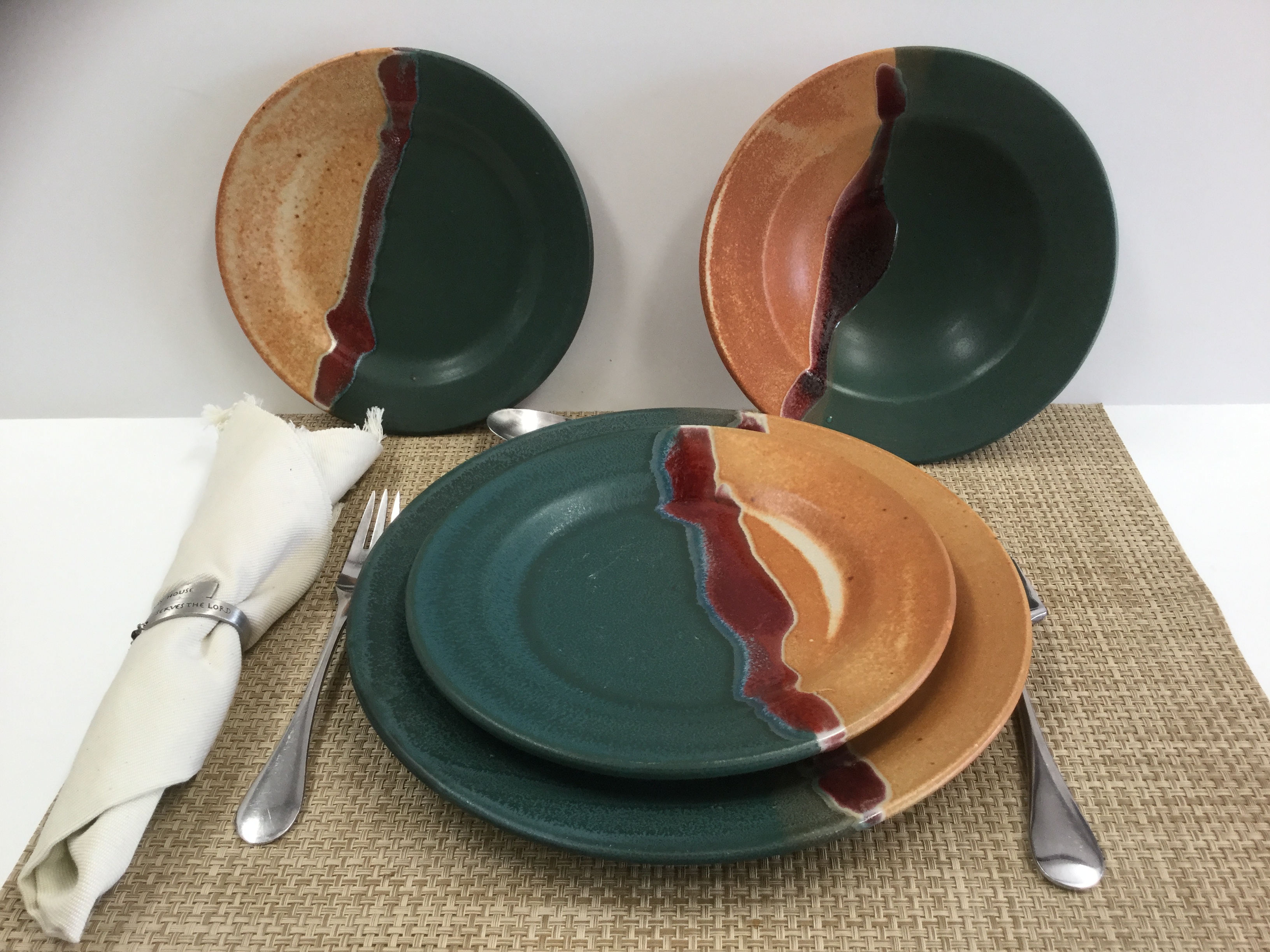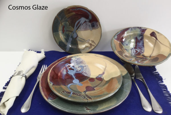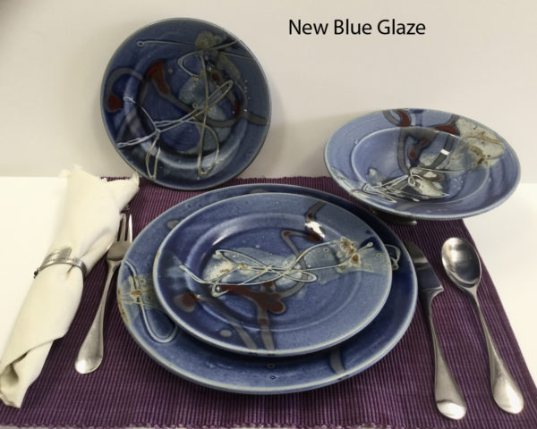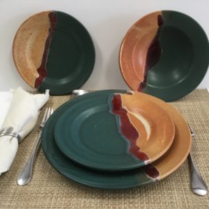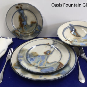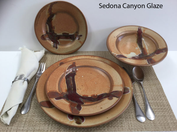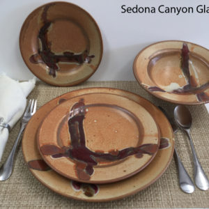 The place setting is comprised of a dinner plate, salad plate, rimmed soup bowl and dessert plate. Each piece is hand made and glazed so there will be some variation in color. These pieces are fired to 2400* and can be used in the dishwasher and microwave. The dinner plate is 11.5″ in Dia. The salad plate is 9″ in dia. The cereal / soup bowl is 8.5″ in dia. and the dessert plate is 8″ in dia.